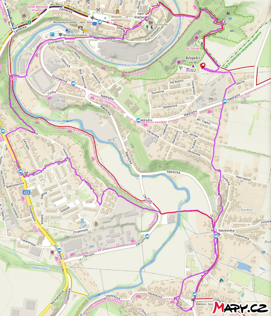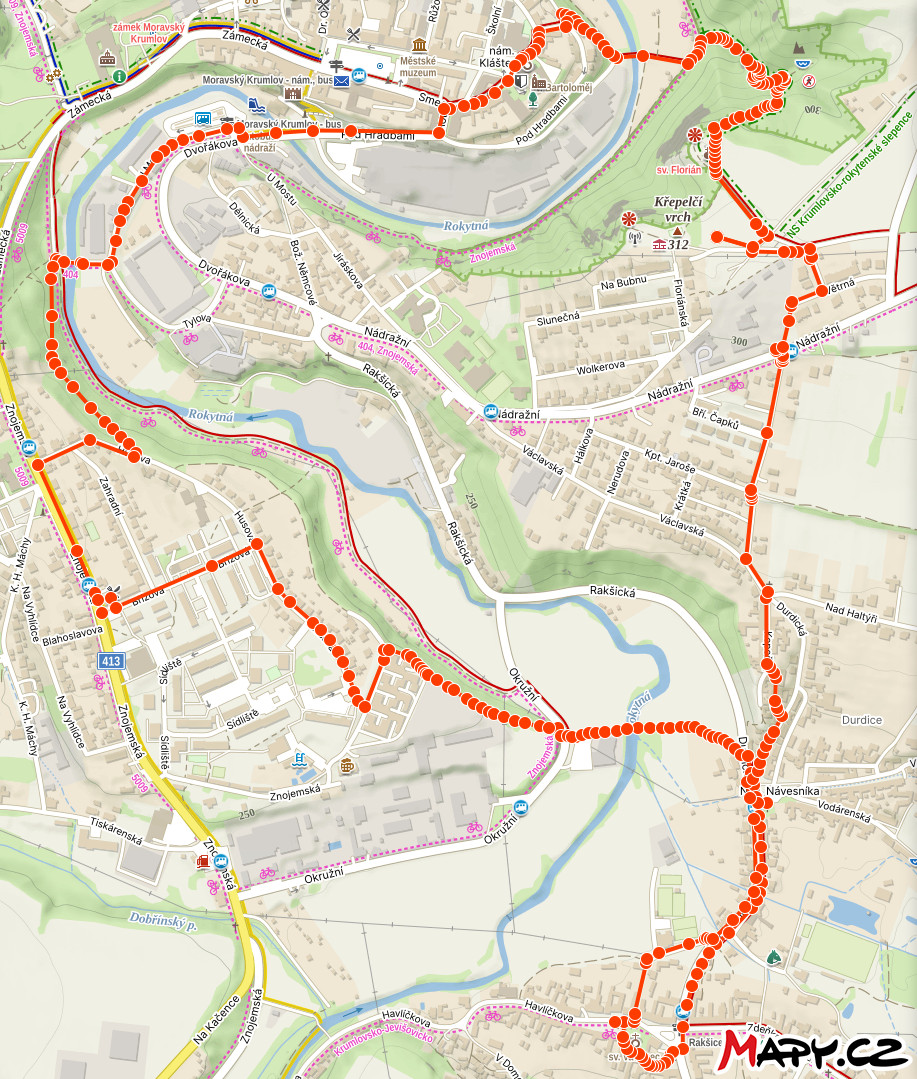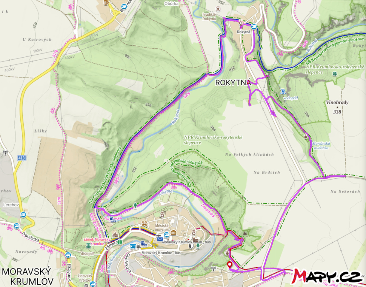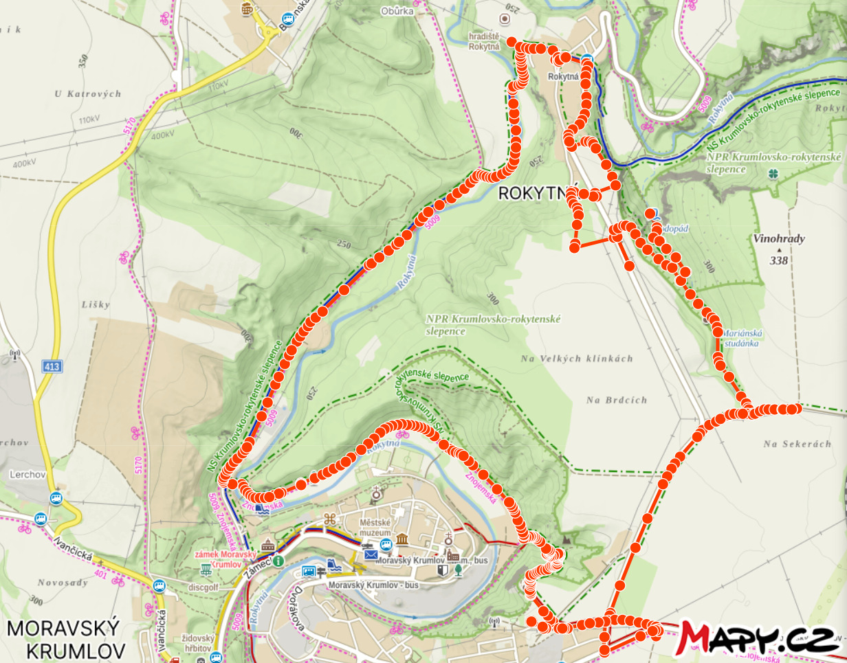Místa na trase: Moravský Krumlov, Národní přírodní rezervace Krumlovsko-rokytenské slepence, Naučná stezka Krumlovsko-rokytenské slepence, Duby v podzámčí (významné stromy), Hradiště Rokytná, Rokytná, Kostel sv. Leopolda, Památník obětem první světové války, Vyhlídkové místo, Kaplička, k vodopádu jsme se nedostali, nebylo kudy, Křížky (něco jako křížová cesta), Studánka Mariánský Pramen Spodní, Kaple Panny Marie, Mariánská Studánka, Moravský Krumlov, Jez pod hradbami, Restaurace U Blondýny, Rakšice, Památník obětem světových válek, Kostel sv. Vavřince, Socha sv. Jana Nepomuckého, Pamětní deska padlým členům TJ Orel, Boží muka a křížky.